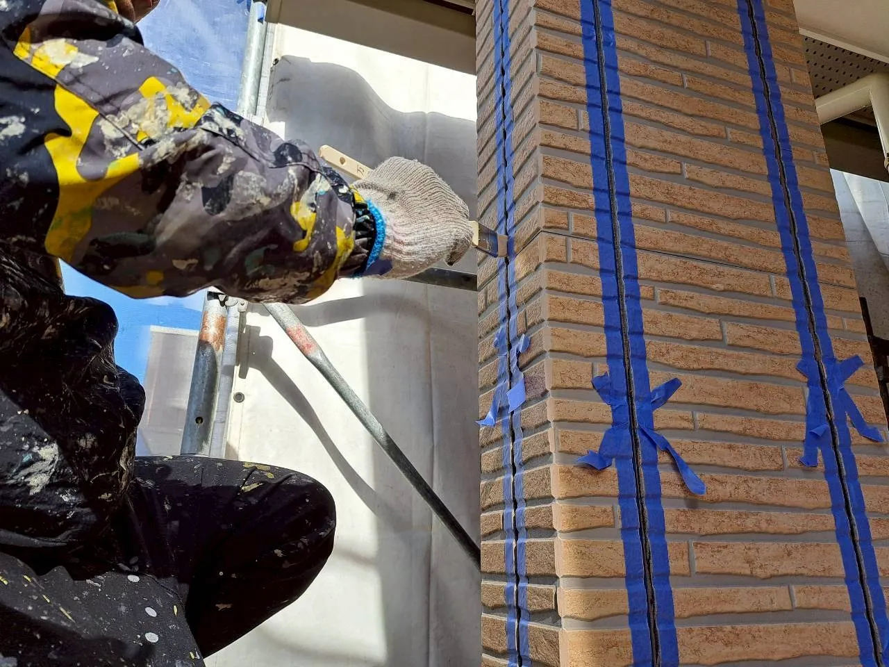 1.目地の清掃・プライマー塗布(写真2枚目):古いシーリング材を撤去した後、新しいシーリング材をしっかり密着させるための接着剤(プライマー)を丁寧に塗布します。職人が細部にまで気を配り、長寿命化の土台を作ります。