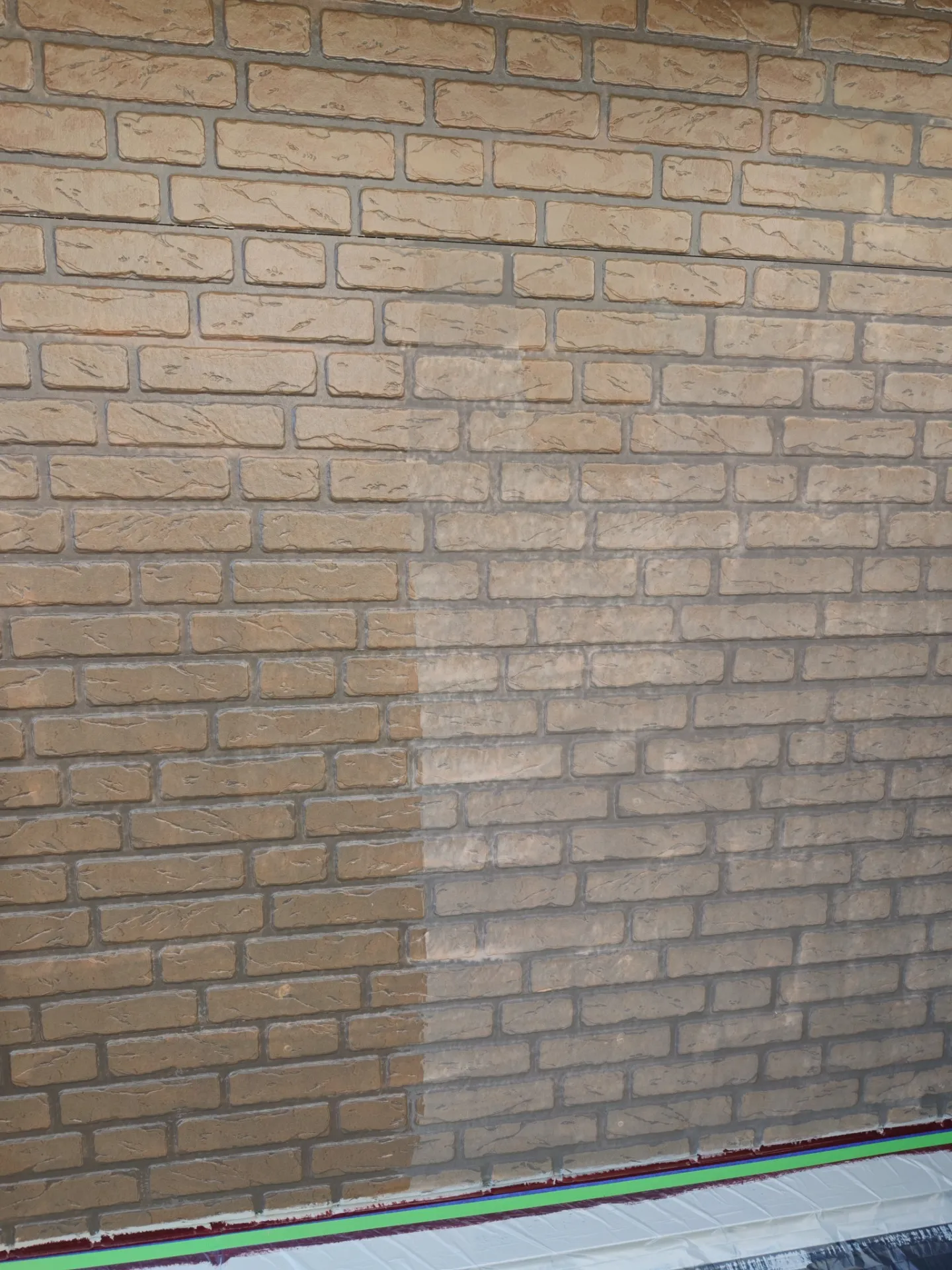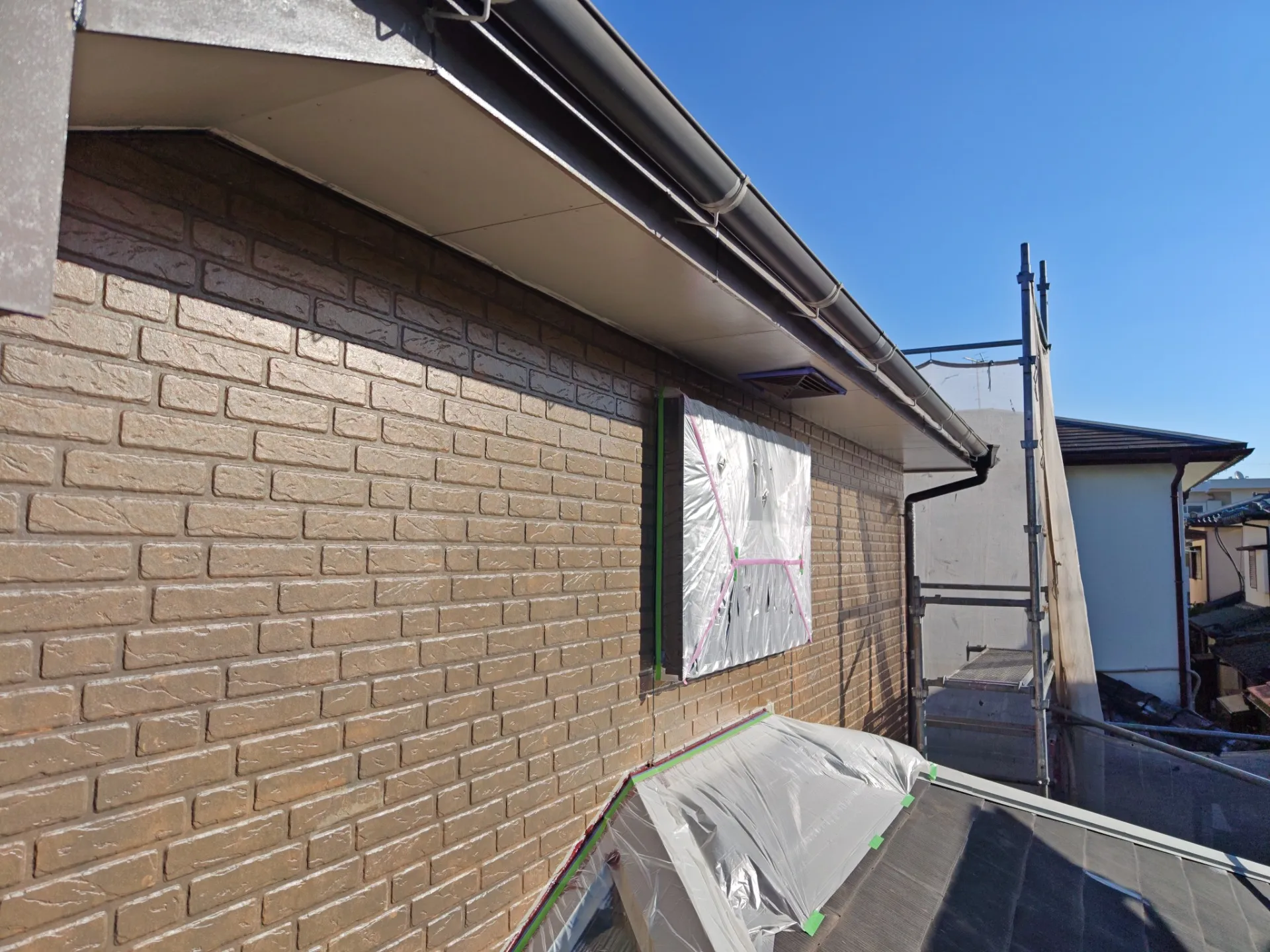 写真は、レンガ調のサイディングに下塗り材を塗布しているところです。