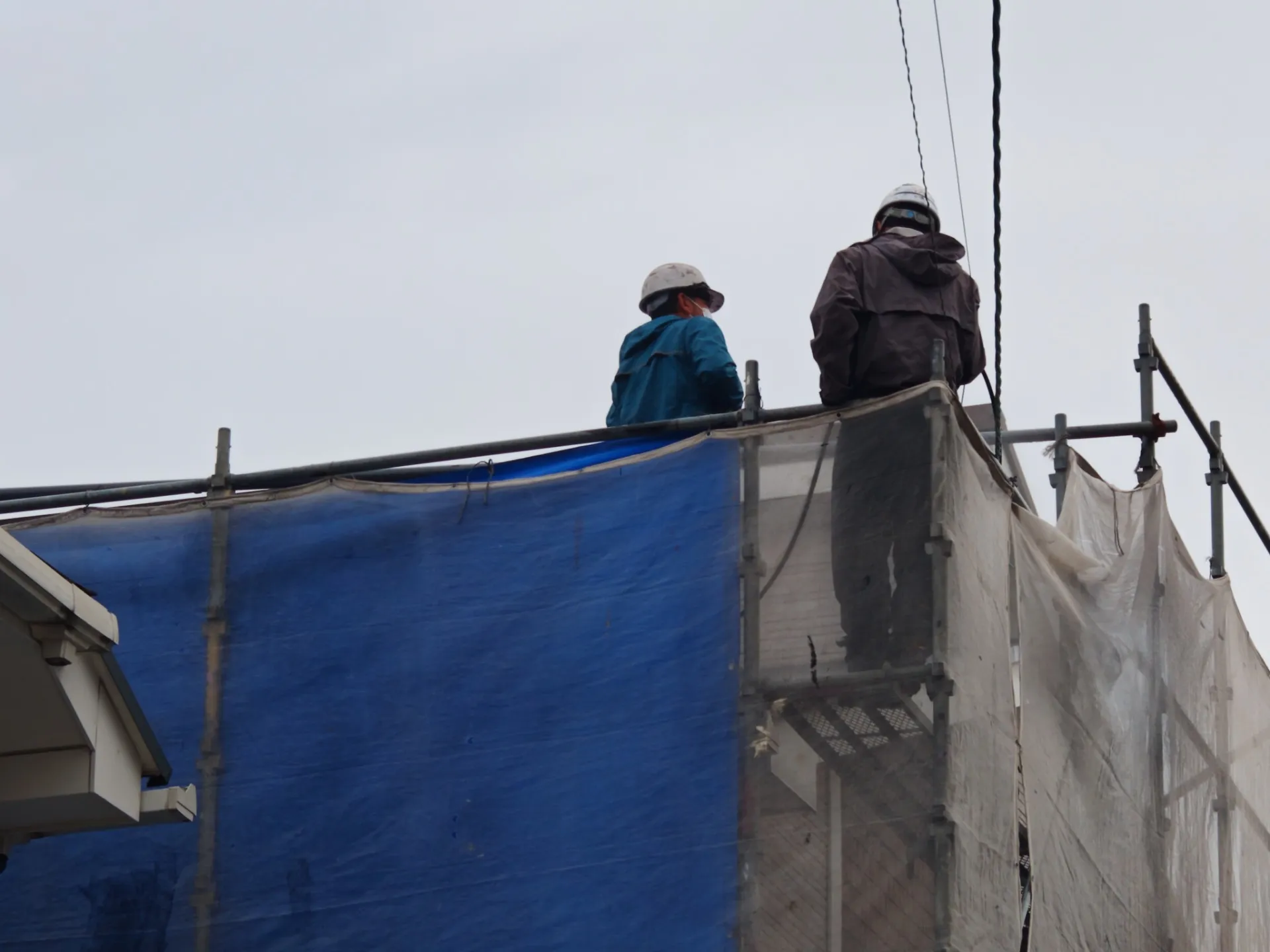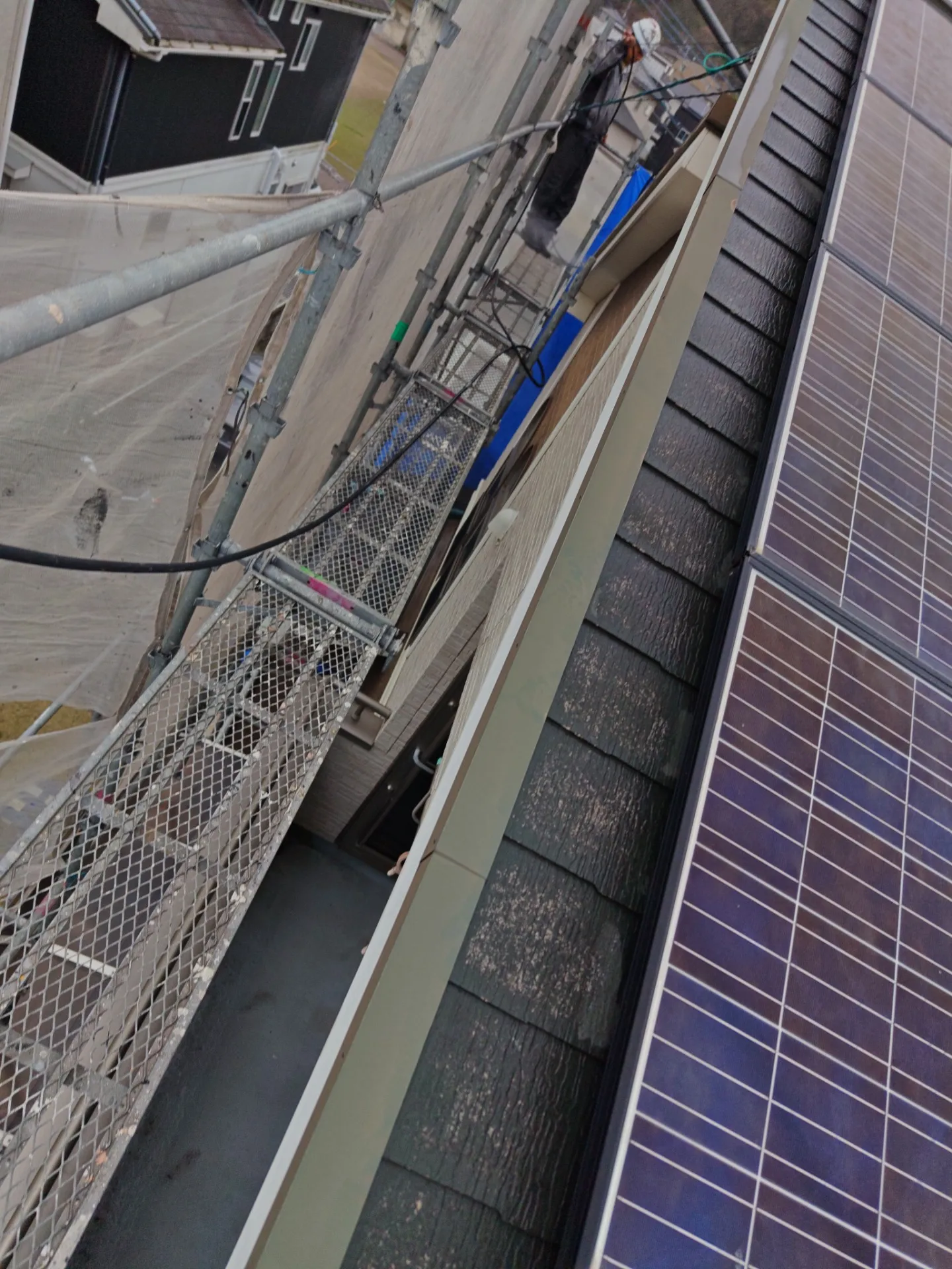 写真のように、職人が足元に注意しながら、水圧を調整して隅々まで丁寧に洗い流していきます。ソーラーパネルが設置されているお宅でも、周囲をしっかり洗浄し、塗装に最適な「スッピン状態」を作り上げます。✨