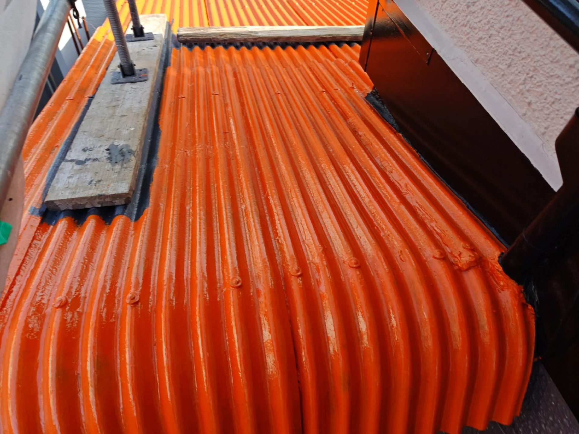 🎨鮮やかなライトブルーの屋根!遮熱塗料を使用し、見た目の美しさはもちろん、これからの☀️季節に備えて機能性もバッチリです。波板部分のオレンジも、下地処理から丁寧に行うことで、ムラのない鮮やかな仕上がり。🧔
