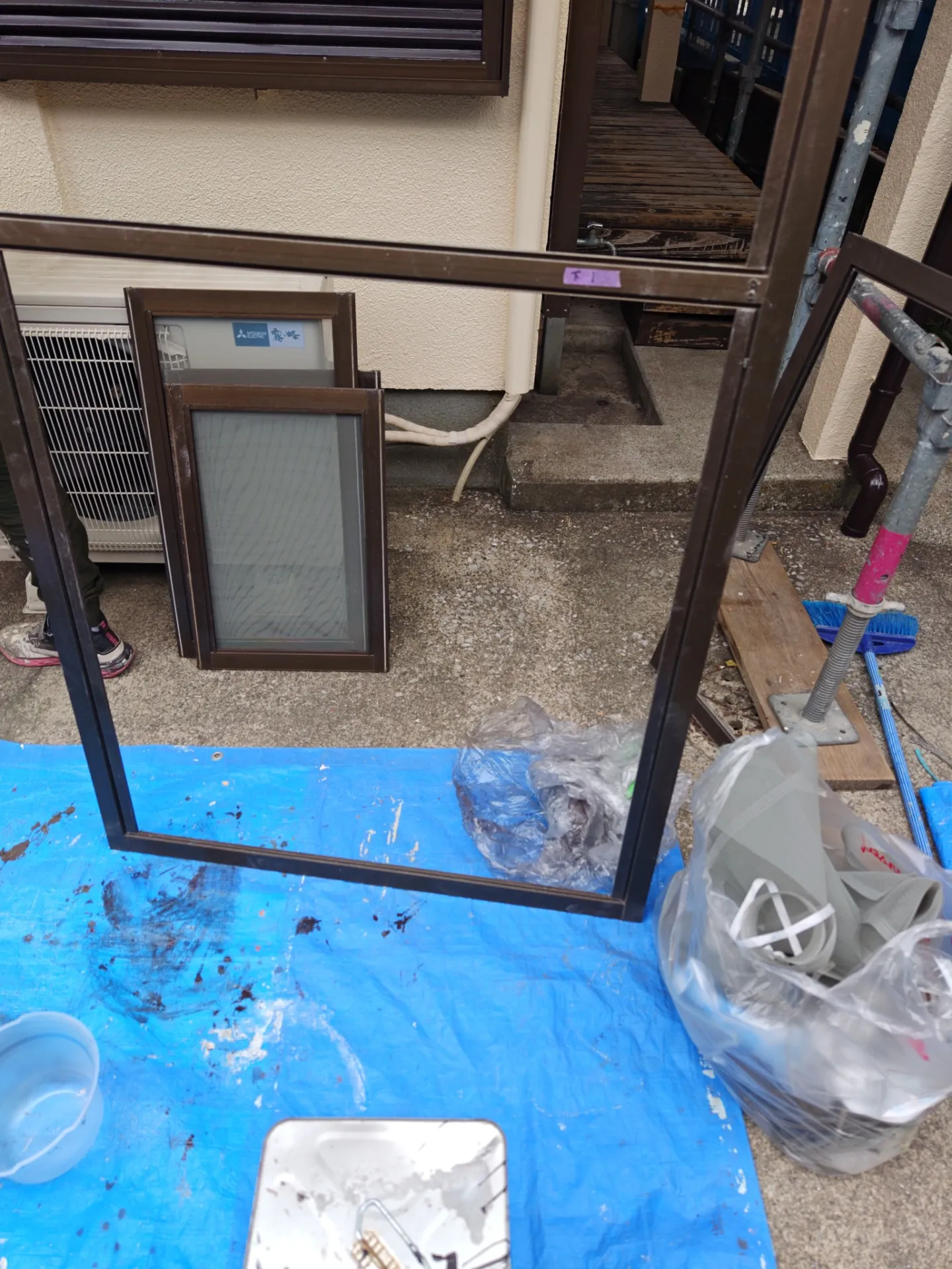 こんにちは、本日完成間近🦟網戸の張替えと合わせて、外壁の木部(雨戸・戸袋など)も塗装させていただきました。🧔